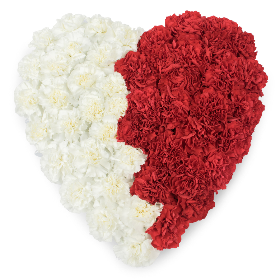 Our Heartfelt Carnation Bouquet combines the classic beauty of red and white carnations in a stunning heart-shaped design. This unique arrangement is perfect for expressing your deepest sympathies with elegance and grace.