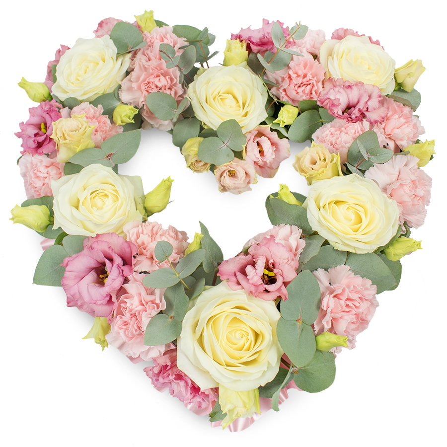 Our Graceful Open Heart Sympathy Arrangement is designed to offer comfort and express your heartfelt condolences. Featuring a beautiful combination of white roses, pink carnations, pink lisianthus, and eucalyptus, this bouquet is thoughtfully arranged in an open heart shape.