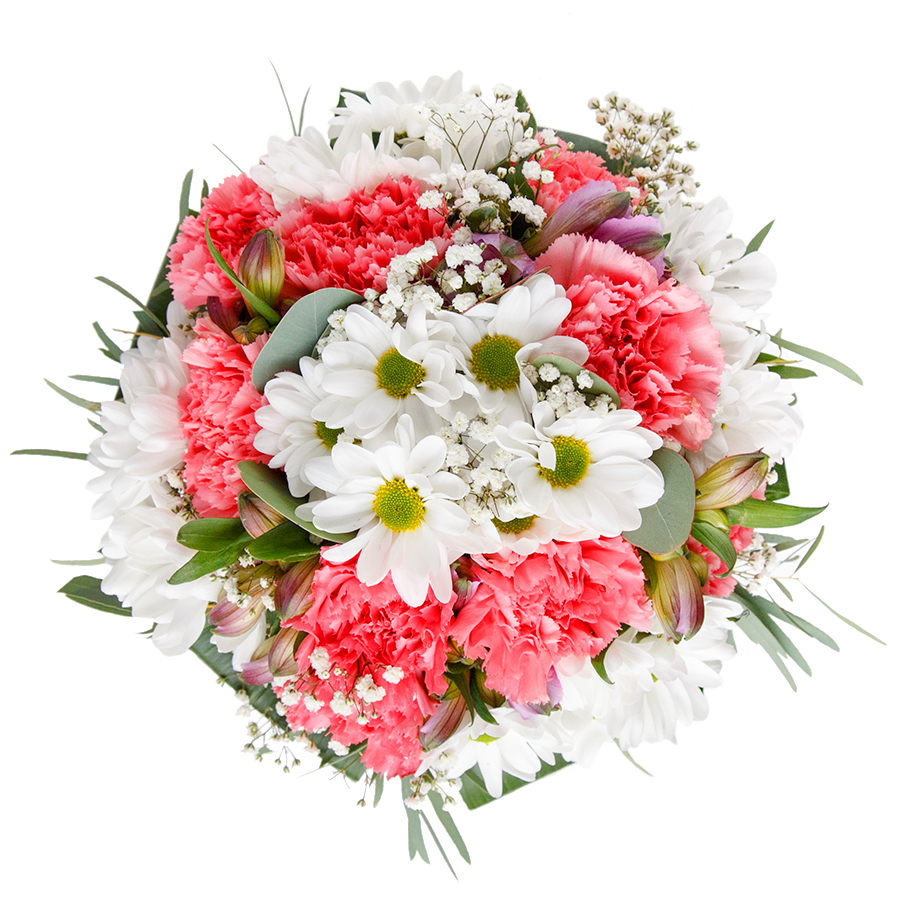 Presenting our stunning floral arrangement, featuring snow-white chrysanthemums, delicate gypsophila, and graceful light pink carnations, all beautifully wrapped in rich aspidistra leaves. This bouquet radiates elegance and charm, perfect for any luxurious gift.